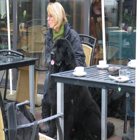 Nash gezellig met zijn natte vacht tegen het been van de vrouw zoooo lief