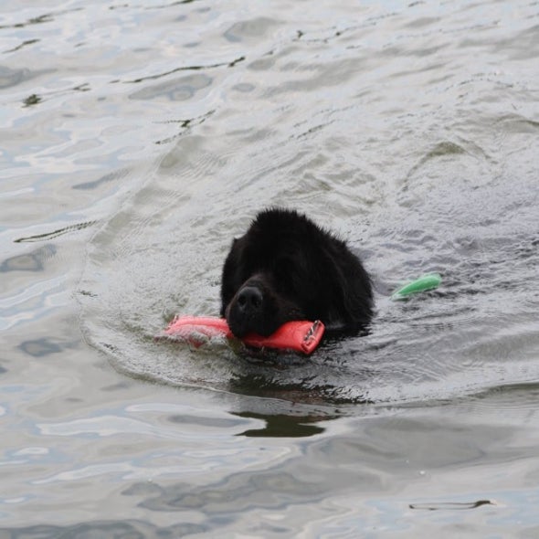 Ja hoor hij heeft netjes de dummy bij de boot gehaald.